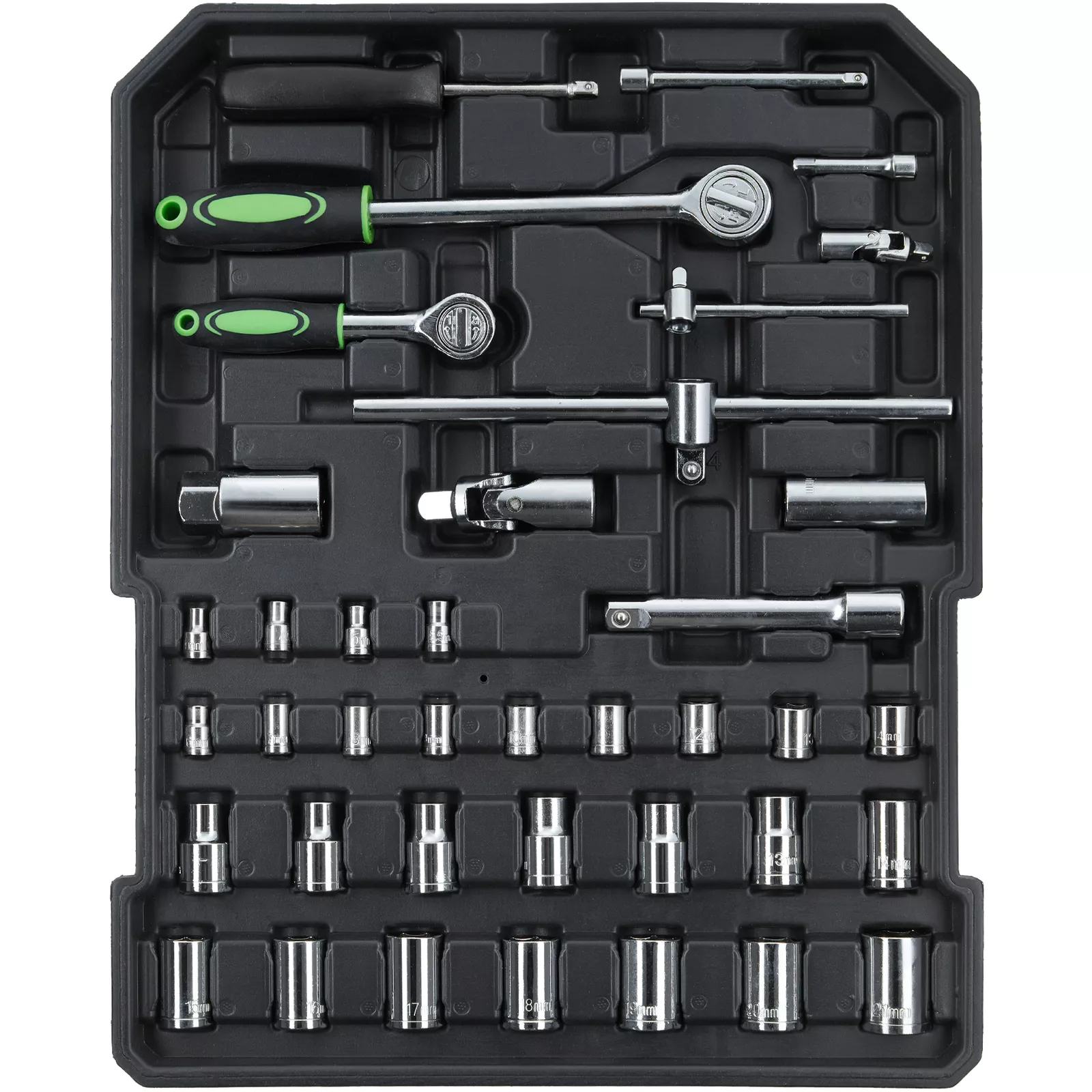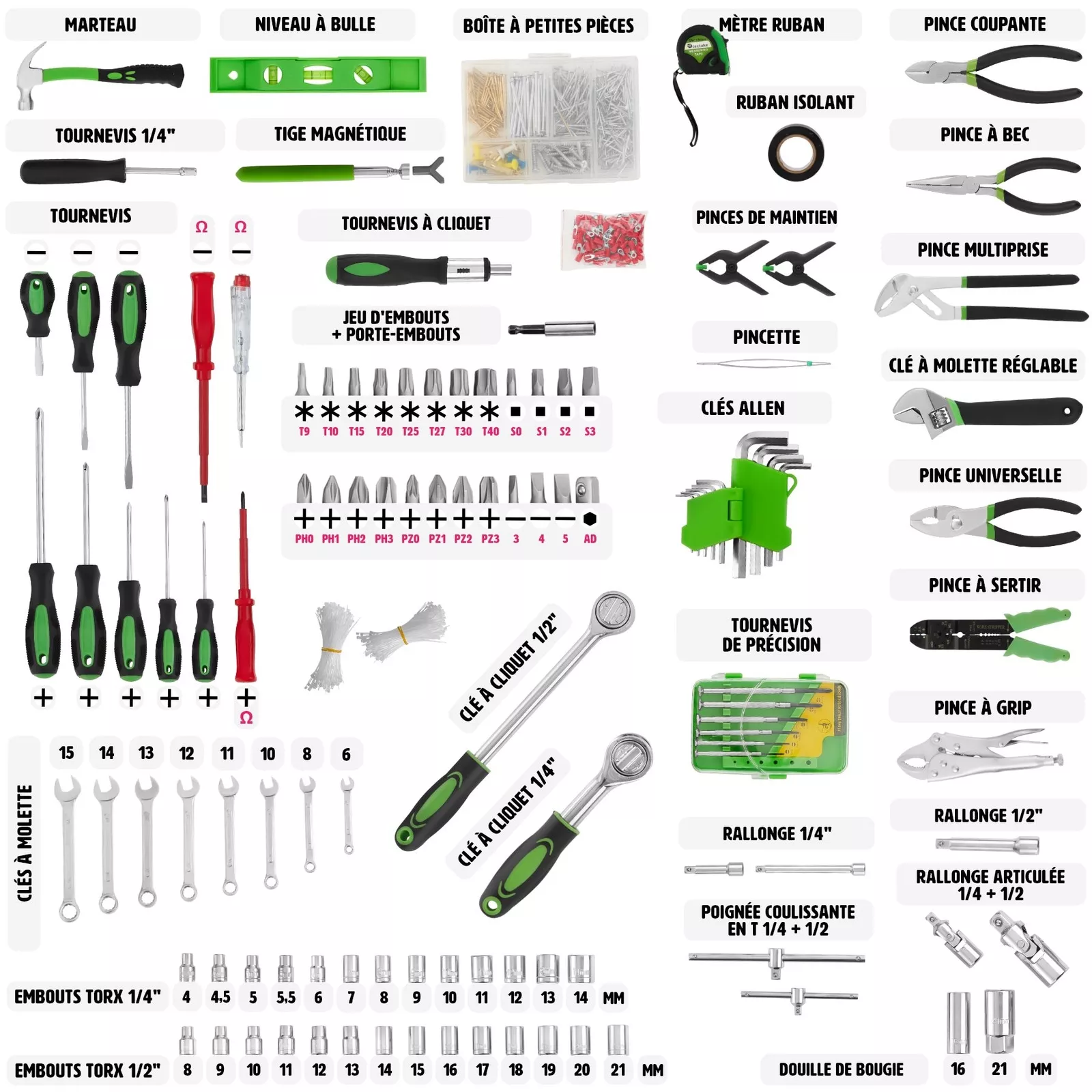 • 14 Douilles ½ pouce (21, 20, 19, 18, 17, 16, 15, 14, 13, 12, 11, 10, 9, 8 mm)