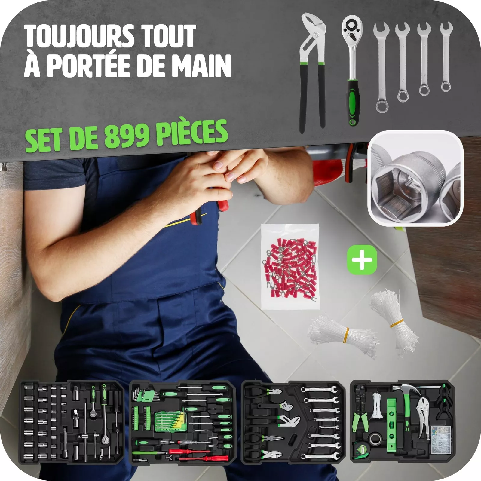 Caisse à outils 899 pièces avec Poignée pliante et télescopique