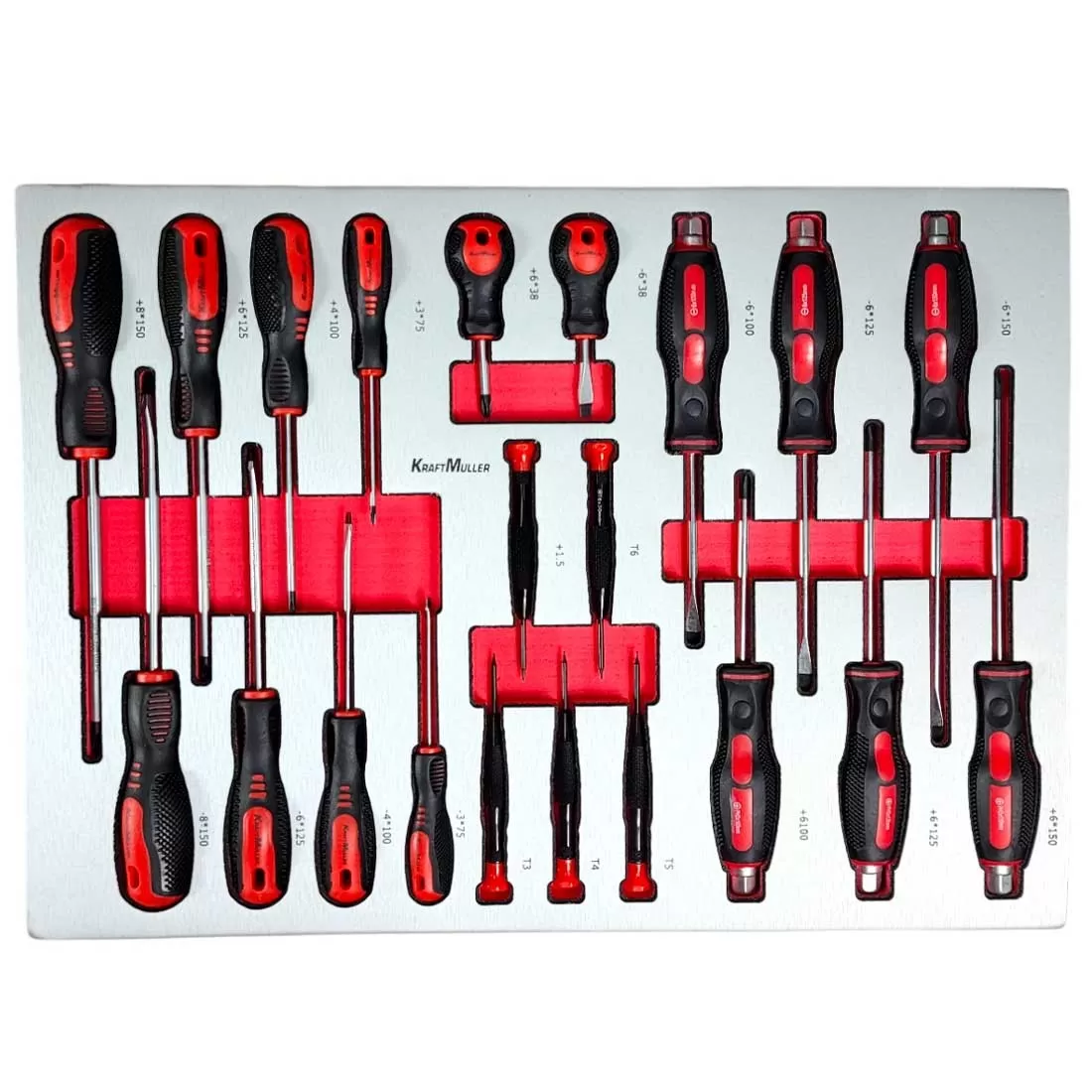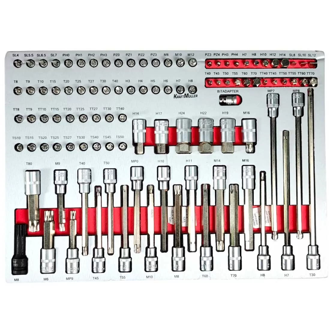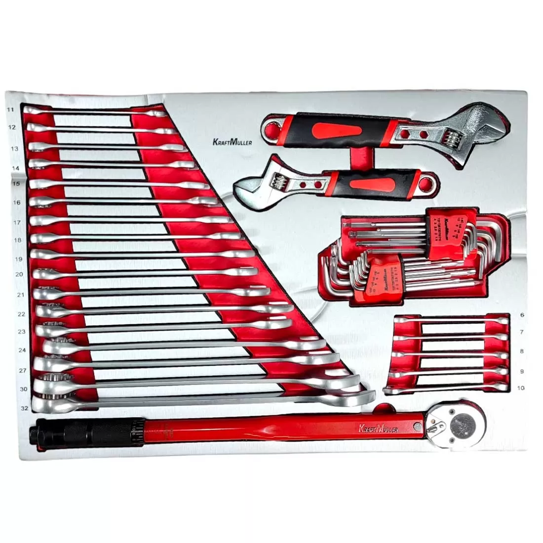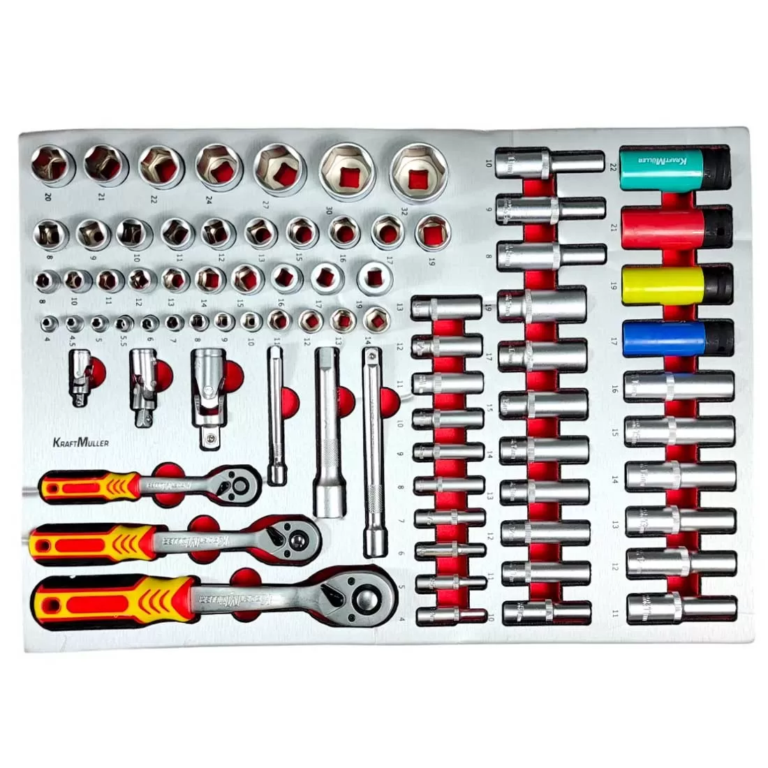 Comprend 296 outils de haute qualité signés Kraft Müller, une marque allemande reconnue. Chaque outil est soigneusement rangé dans des compartiments en mousse EVA pour une organisation parfaite.